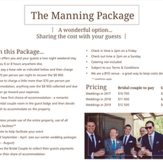 Accomodation: Cost for 2 nights for the bridal couple is is $1150 in 2018 or $12500 in 2019. Guests pay a combined $8900 for the 2 nights. For example, 64 guests at the rate of $70 equals $8900.